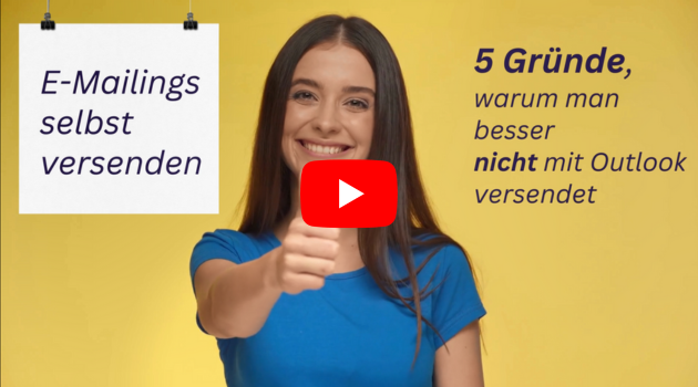 In unseren kurzen Videos erklären wir Ihnen jeweils Schritt für Schritt, wie Sie ein E-Mailing einstellen. Sie finden kurz zusammengefasst, was beim E-Mailing-Versand wichtig ist. Und schließlich zeigen wir Ihnen ganz konkret, wie Sie mit wenigen Klicks ein professionelles E-Mailing erstellen und einiges mehr.